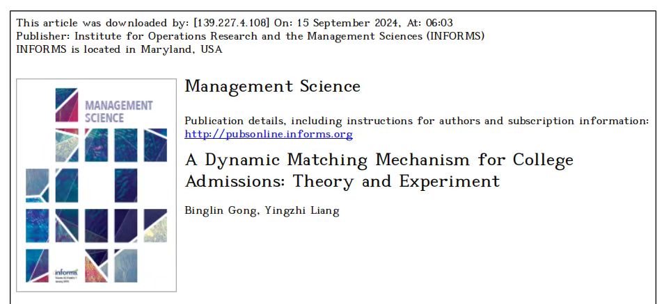近日,yl6809永利龚冰琳研究员作为第一作者,与合作者关于内蒙古高考招生动态匹配机制的合作论文“A Dynamic College Admission Mechanism in Inner Mongolia: Theory and Experiment”发表于国际公认的经管顶级期刊《Management Science》。
