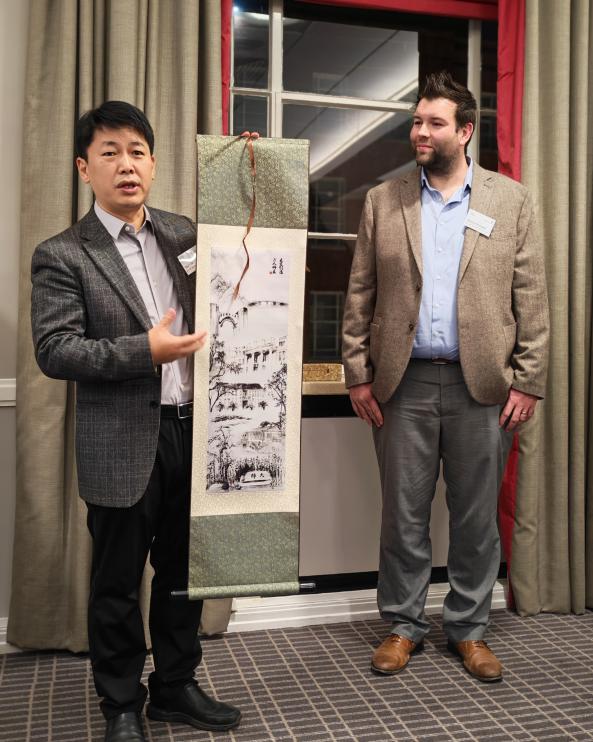 1月17日,在利兹大学商公司的安排下,经管访学师生来到利兹大学University House参加欢迎晚宴,利兹大学商公司邀请了MBA项目授课教授和在读员工一同共进晚餐。饭前,贾利军教授代表华东师大经管公司向利兹大学商公司赠送“印象华师大”的友好礼物,利兹大学商公司MBA项目负责人对访学团的到来表示热烈欢迎,双方师生进行了亲切热情的友好交流。