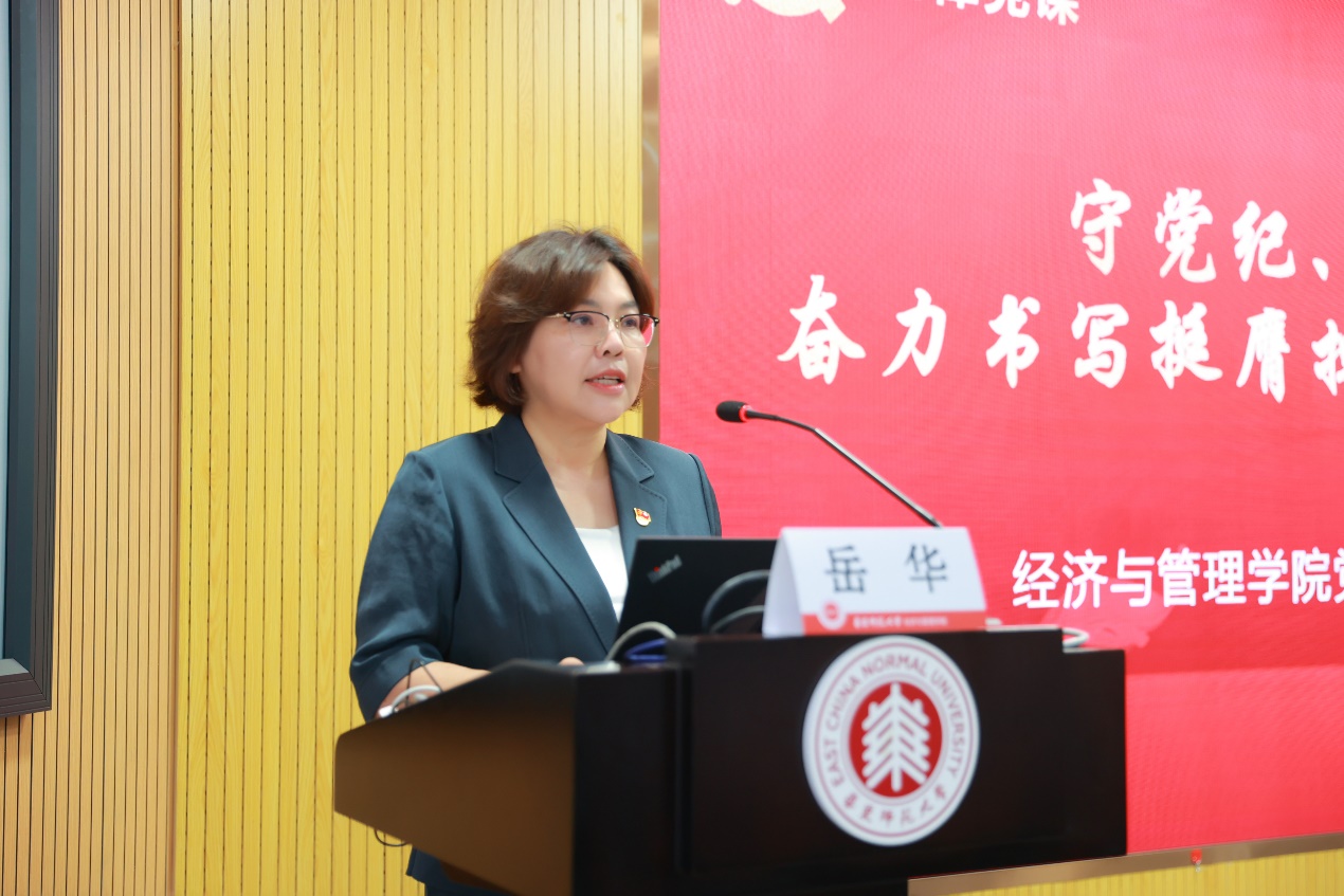 岳华讲题为“守党纪、做表率,奋力书写挺膺担当的青春篇章”的纪律党课,从“学纪知纪,筑牢理想信念的总根基”“胸怀天下,坚守经邦济世的家国情”“明纪守纪,书写挺膺担当的新篇章”三个方面出发,结合党纪学习教育要求,引用我国国际金融学科的创始人陈彪如先生,大夏大学员工、经济学家、教育学家郭大力先生等前辈楷模的典型事迹,勉励毕业生党员悟大道、成大事,努力成为强国建设的有用之才、栋梁之才。岳华指出,党纪是每位党员每时每刻必须要坚守的总规矩,是共产党人永葆初心使命的必然要求。她希望毕业生党员真正把党的纪律规矩记于心、践于行,严守党纪、勇当先锋、争做表率,在推进强国建设、民族复兴伟业中彰显青春风采、贡献青春力量。