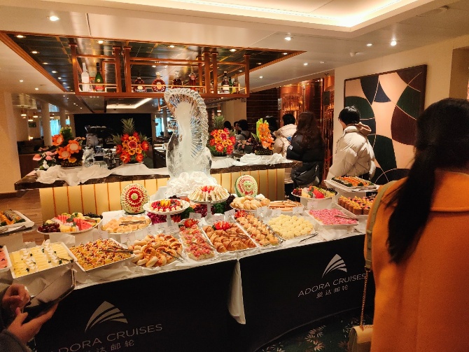 在邮轮餐饮区域,师生们重点了解了邮轮上餐饮业态及其商业模式。作为邮轮非房费收入的核心来源,“爱达·魔都号”构建了多层次的餐饮产品体系。在基础供给层面,三间主餐厅通过分时段轮转制实现日均2400人次的标准化服务,其菜单设计深度融合本土化战略——食材采购主要来自长三角地区,既降低了物流成本,亦通过“清宫万寿宴”“江南船菜”等主题菜品强化了本地文化特色。高端餐饮由九间特色餐厅支撑,国际化与本土化差异明显,其中“海上丰泽园”引入北京老字号服务团队提供仿膳宴席,充分体现了中华文化IP对文旅产品吸引力的提升作用。