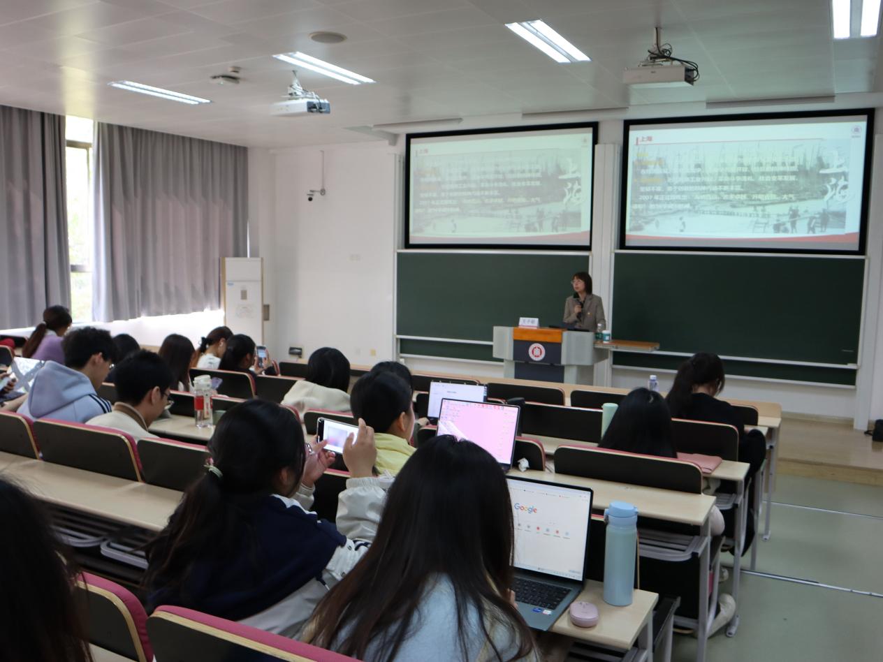 活动伊始,王子蕲以问题导入,引出对上海“海纳百川、追求卓越、开明睿智、大气谦和”16字城市精神的介绍,同时简要概述了上海发展过程中产生的精神谱系。她以自身经历为例,将上海多年的发展变化一幕幕地展示在学员面前,分享了自身的所思所悟。