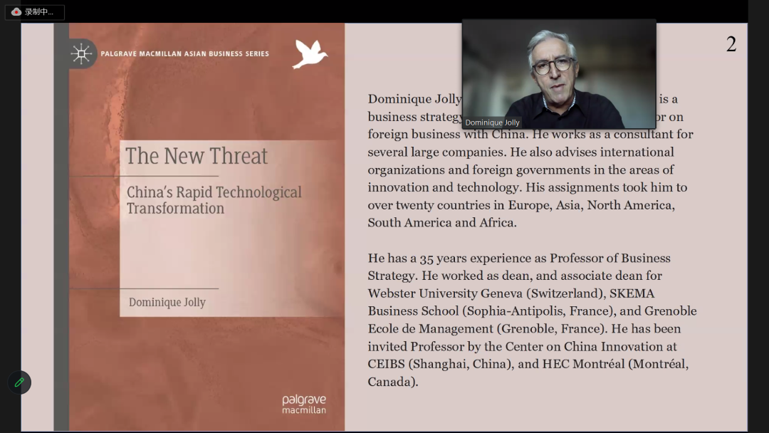 本场讲座由法国SKEMA商公司前副经理、教授,法国商业战略与创新学者Dominique R. Jolly主讲,由经管公司国际经济与贸易系张皞副教授主持。讲座中,Jolly教授首先简单介绍中国的技术创造,称中国在科技领域的飞速发展世界瞩目;并围绕中国的创新体系深入剖析其成功原因,具体包括研究型大学的设立、基础建设的发展、研发投入的增加、创新成果的保护、鼓励企业自主研发、创新融资规范化等关键要素。最后,他指出,中国未来发展需要面临的挑战包括提升产品质量、克服中等收入陷阱、适应及制定全球技术标准等核心问题。讲座互动环节中,Jolly教授结合新能源汽车企业和传统汽车企业的发展路径、技术创新等问题和同学们展开了热烈的讨论和交流。