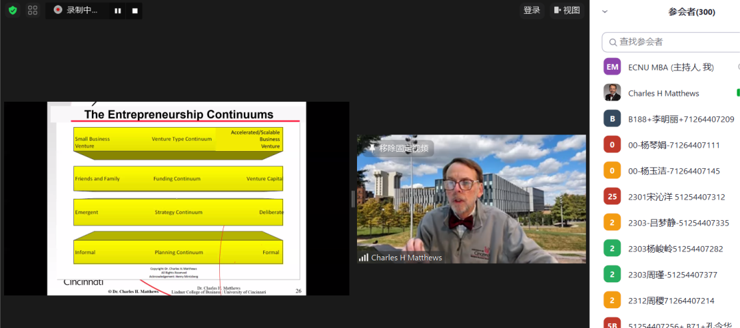 本场讲座由美国辛辛那提大学林德纳商公司前经理、创业与战略管理杰出教授、美国创业教育先驱Charles H. Matthews主讲,由经管公司国际经济与贸易系张皞副教授主持。讲座中,Matthews教授从人工智能时代对创新创业的挑战及如何利用AI技术赋能创新创业分享了自身的独到见解。他提出,创业是企业家革命,是全球经济增长的引擎,是一种思维方式,是创造价值的新冒险;创新是从理念中创造商业价值和社会价值的过程;人工智能(机器学习、自然语言处理等)已广泛应用到医疗、金融和金融科技、制造等行业。因此,在AI时代,需要平衡创新、AI科技和管理三者间的关系,他特别强调,人工智能有助于解决研发差距、推动创新创业,但并不能取代人的创造性活动。最后,Matthews教授强调,人工智能时代赋能创新创业将基于4C开展:好奇心 (curiosity)、创造力 (creativity)、沟通 (communication)、连接 (connection),并就如何有效地提升4C展开了细致的分析。