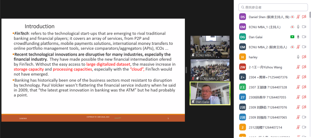 为进一步推进公司相关研究领域的交流合作,为研究生搭建学习借鉴、对话研讨的平台,将研究生引领至学术最前沿,促进公司研究生实践能力与研究能力的双元提升,由研究生院主办,yl6809永利承办的2023国际知名学者大讲堂—“人工智能技术时代管理前沿与金融创新”全球云讲堂活动于2023年11月8日,通过线上线下结合的形式精彩开讲。该系列讲座特邀以色列顶级经济学家、亚太顶尖金融学家、美国创业教育先驱、法国商业战略与创新学者齐聚云讲堂,在Zoom平台与普陀校区小教楼101、201教室同步开启。该活动吸引了500余名在校员工线上线下同步参与,由yl6809永利李嫦、张皞副教授联合主持。
