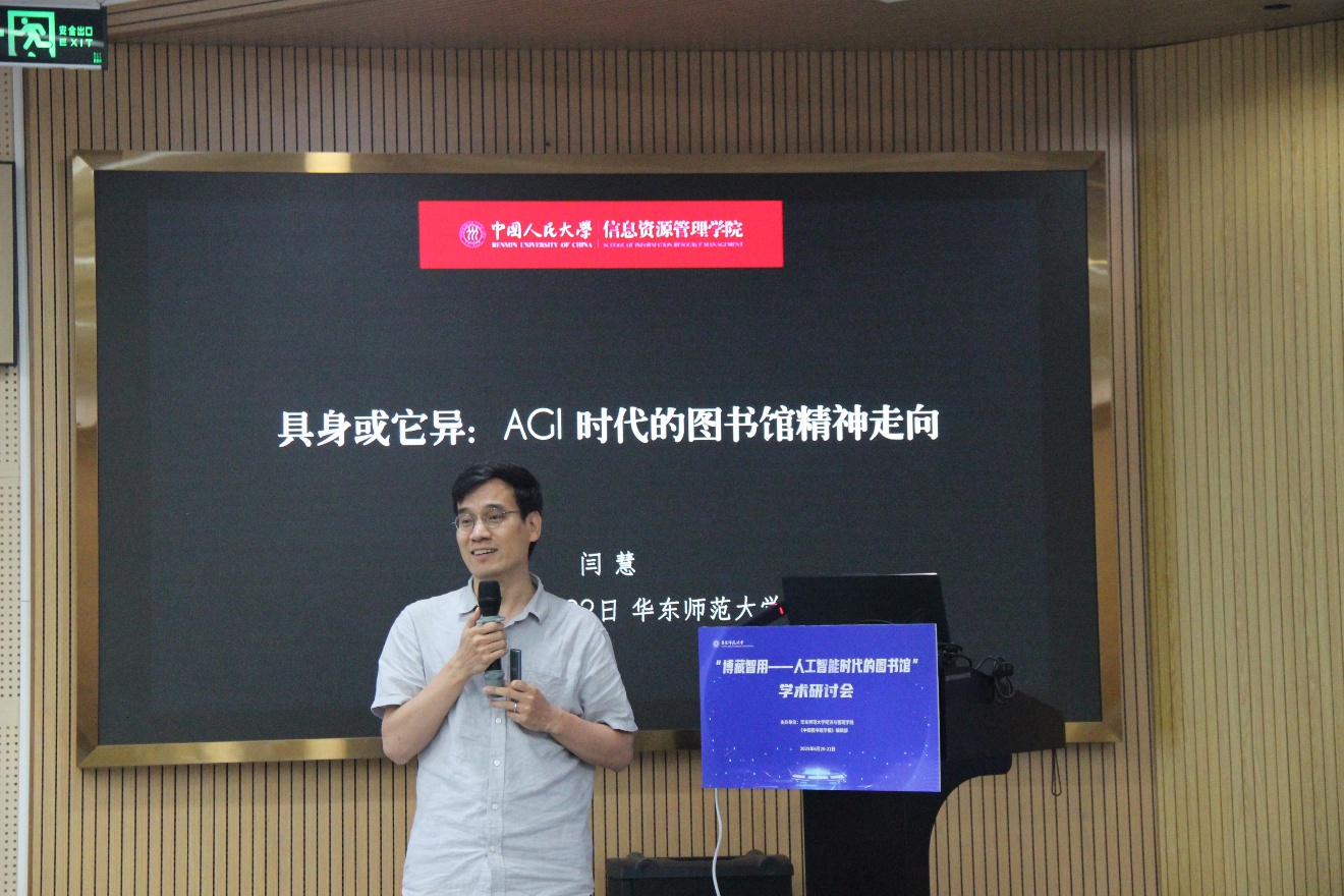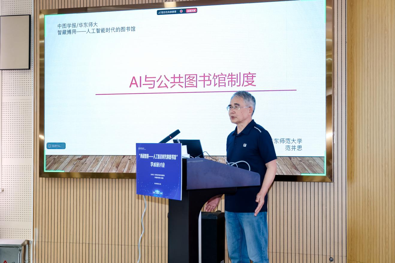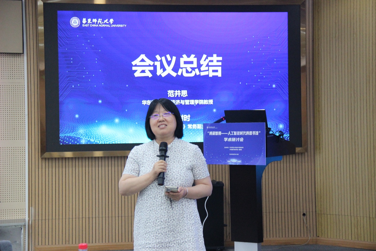 研讨会总结环节以“坚守初心,拥抱变革”为主题。范并思教授指出,会议围绕图书馆、AI两大主题,在理论、技术、专业层面形成多维探讨。他强调,图书馆的职业理念与社会作用在AI时代愈发重要,青年学者需以批判思维推动学科创新。