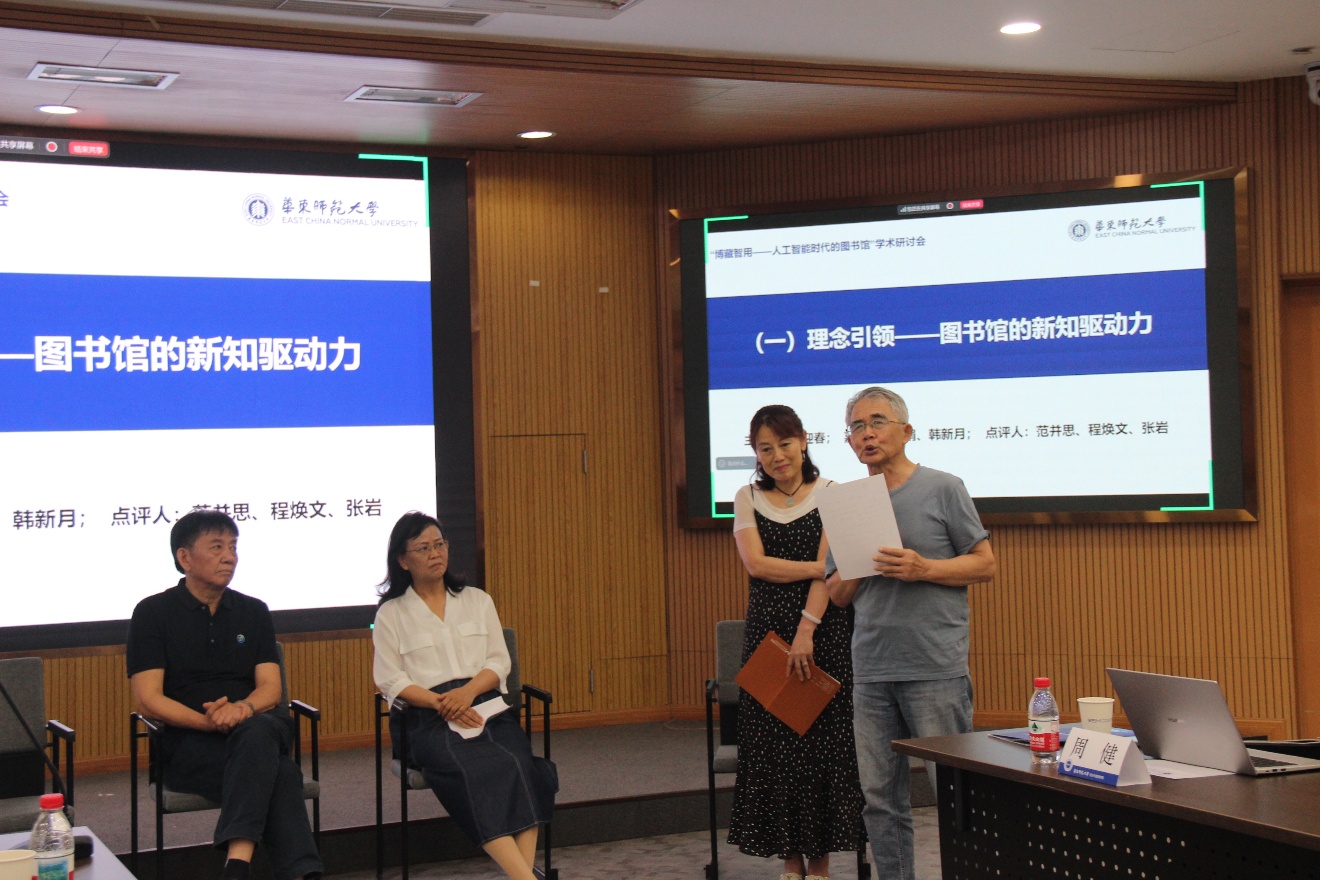 6月22日上午为青年学者报告、点评、开放研讨环节。“理念引领——图书馆的新知驱动力”主题青年学者报告和研讨由上海外国语大学图书馆馆长蔡迎春主持。北京大学信息管理系图书馆学教研室主任李世娟以“基层图书馆为基,分层分类服务为体,人工智能赋能为用”为主题展开探讨,关注阅读的代际传递效应,严谨的实证研究为基层图书馆发展提供实证与技术路径参考。国家图书馆数字资源部副主任韩新月分享“数字叙事新实践与图书馆服务新视角”,通过展示国家图书馆的实践案例,分析技术与叙事融合的特征,如双向互动、多媒体元素、用户共创等,提出图书馆需在数字叙事中平衡技术适配性与伦理风险,通过多元化叙事主体激活馆藏资源。在点评环节,范并思、程焕文、张岩对上述分享进行细致点评,并针对提及的阅读代际传递、图书馆的责任、图书馆的宣传重点等问题开展深入讨论。