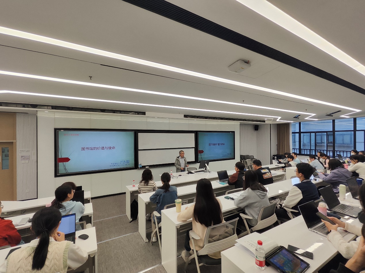 首先范并思教授向同学们介绍了图书馆职业迈向专业领域的发展历程,并对图书馆的使命和核心价值进行了详细剖析。范并思表示,此前图书馆人对图书馆价值与使命关注不多,然而信息时代到来后,公众获取信息方式改变,图书馆面临发展危机,如公共图书馆随着互联网发展出现诸多问题,包括不再是唯一公共信息中心、数字阅读兴起使其自有阅读资源优势不再等,高校图书馆面临投入和需求双重减少等问题。因而图书馆人应高度关注图书馆的价值与使命,通过发布政策文件宣扬,同时不断进行服务创新,扩展服务范围,也详细介绍了中国图书馆学会《图书馆服务宣言》修订过程。