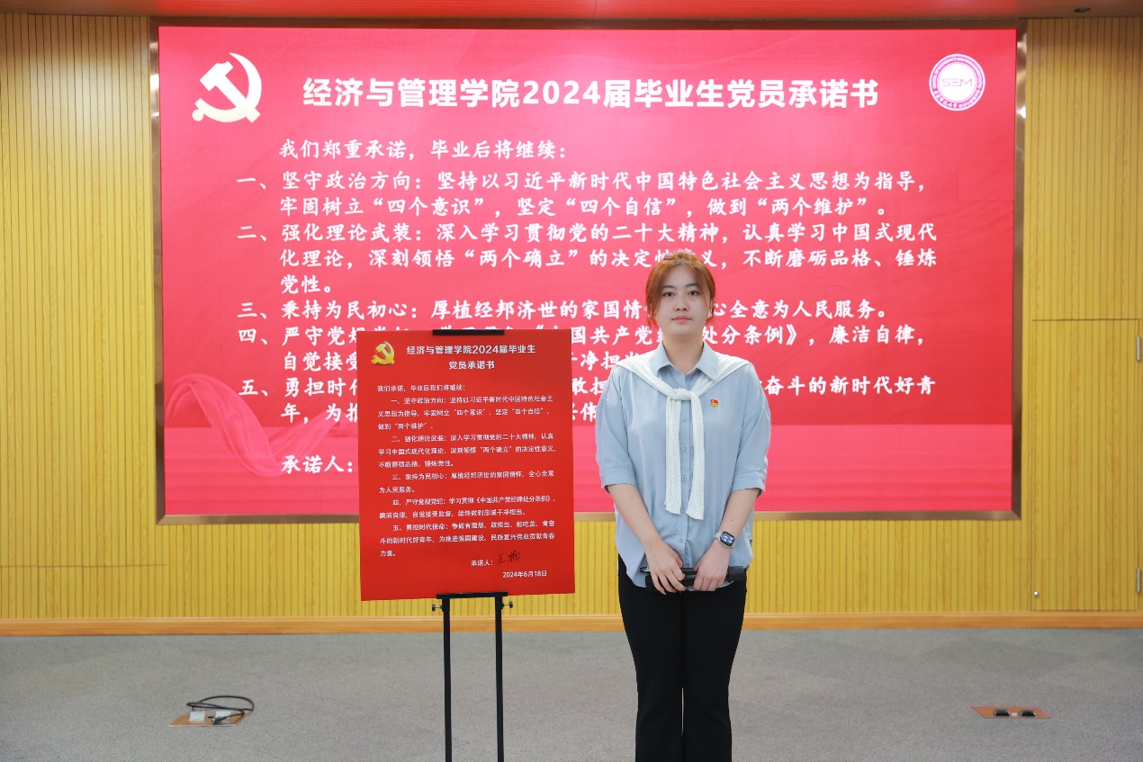 2022级工商管理专硕(MBA)党支部书记王楠代表全体毕业生党员郑重承诺并签订承诺书。她承诺,毕业后将继续坚守政治方向,坚持以习近平新时代中国特色社会主义思想为指导;强化理论武装,不断磨砺品格、锤炼党性;秉持为民初心,厚植经邦济世的家国情怀;严守党规党纪,始终做到忠诚干净担当;勇担时代使命,为推进强国建设、民族复兴伟业贡献青春力量。