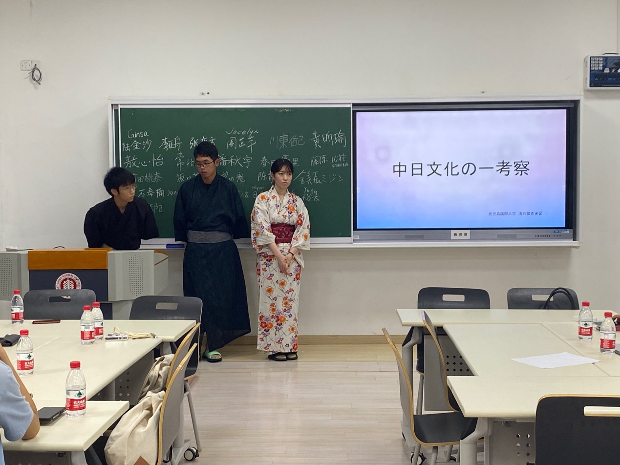 下午,两校师生在文史楼110教室开展了丰富多彩的交流活动。首先在破冰环节,同学们通过互动小游戏进行了自我介绍,拉近了彼此的距离。鹿儿岛国际大学的同学们身着日本传统服饰,汇报了本次在上海交流走访的真实感受,并就中日饮食文化差异、中日文化休闲活动、鹿儿岛旅游目的地发展等研究课题进行交流,增进了双方对中日传统文化以及地方文旅产业的了解。