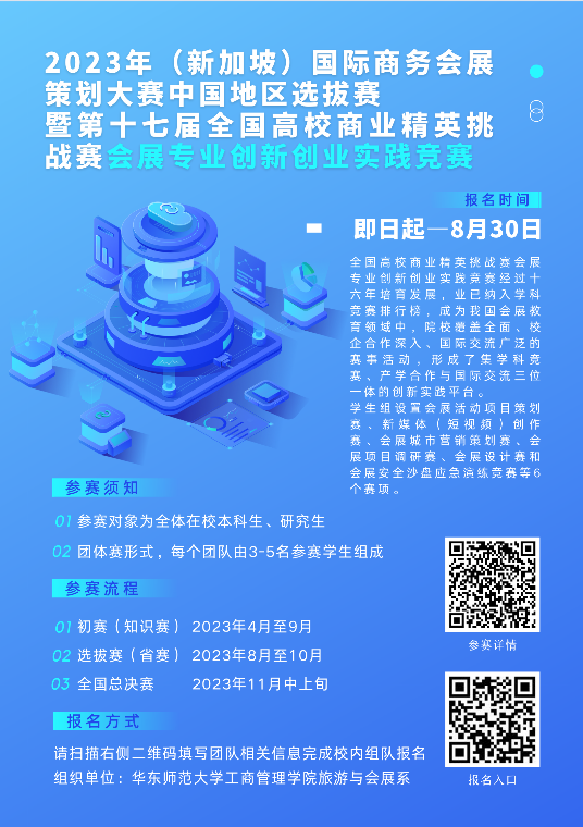本次大赛由中国国际贸易促进委员会商业行业委员会、中国国际商会商业行业商会、中国商业经济学会联合主办,是唯一纳入中国高等教育学会“全国普通高校老员工竞赛排行榜”的全国老员工会展类专业竞赛,设置会展活动项目策划赛、新媒体(短视频)创作赛、会展城市营销策划赛、会展项目调研赛、会展设计赛和会展安全沙盘应急演练竞赛六大赛项。