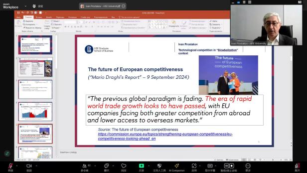 本场讲座由俄罗斯高等经济大学(HSE)前外事副董事长、商学研究生院现任副经理Ivan Prostakov教授主讲,由经管公司经济学系系主任陈琳教授主持。讲座中,Ivan Prostakov教授详细讲解了“慢全球化”背景下的技术竞争,揭示了全球化新范式的变革及其对经济的深远影响。教授指出,当前全球经济面临的贸易限制和地缘经济碎片化正在加剧,导致欧盟企业在国际市场上的竞争压力增大。以往的全球化范式虽然帮助了欠发达国家,但未能根除国家之间的不平等。他强调,在全球技术变革中,人工智能的崛起带来了新兴经济体中新的参与者和竞争者。尽管AI技术促进经济增长的潜力巨大,其对就业市场的影响仍然未知,这可能会加剧发达国家内部的不平等现象。教授提到,在技术基础设施和数据可用性上,各国存在显著差距。高收入国家在技术领域仍占据主导地位,但一些中低收入国家也在快速崛起,尤其是金砖国家进展显著。