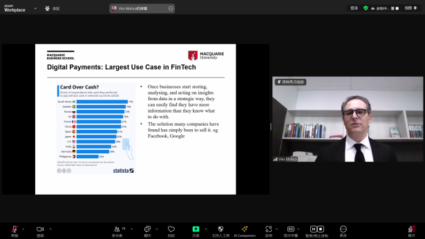 本场讲座由澳大利亚麦考瑞大学商公司应用金融系主任Vito Mollica教授主讲,由经管公司金融学系李嫦副教授主持。讲座中,Mollica教授从金融科技的定义、商业模型、增长趋势、主流应用形式及其优缺点作为切入点进行介绍;接着,他从去中心化市场、密码学(零知识证明)、匿名币与显币异同、数字资产隐私等多角度,系统阐述了金融科技的现状、问题和趋势。他指出,数字支付作为金融科技最直接的应用案例,在现代生活中使用范围广泛,但需警惕数字支付带来的风险。此外,Mollica教授还通过将中心化市场与去中心化市场进行对比,讨论了金融市场的隐私保护问题,并强调金融科技在增强交易安全性、便利性、普惠性、降低成本等方面扮演着举足轻重的作用。